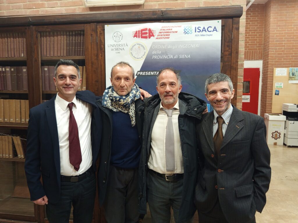 Nella foto Antonio Greco (speaker, MPS), Simone Scapecchi (organizzatore, MPS), Riccardo Salvini (organizzatore, MPS) e Salvatore Sollami (speaker, IBM)